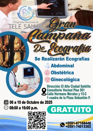 El Programa Nacional de Telesalud, en coordinación con la Escuela de Gestión Pública Plurinacional, organiza la Campaña de Ecografía Abdominal, Ginecológica y Obstétrica, a desarrollarse del 06 al 10 de octubre, en la ciudad de El Alto – Ciudad Satélite, específicamente en el Consultorio Vecinal Plan 561, ubicado en la calle Hermano Morales y 15-C, a una cuadra de la Plaza Sebastián Pagador.